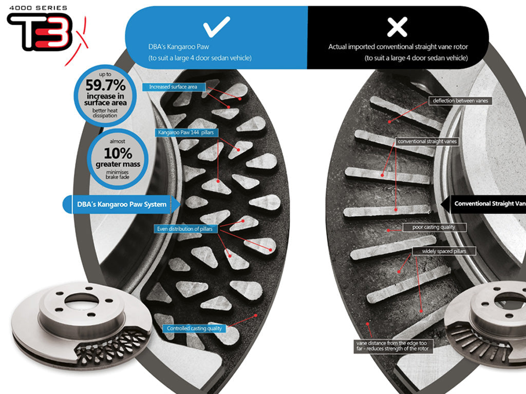 - T3 Brake discs feature patented 'Kangaroo paw' ventilation design provides greater heat dissipation minimising brake fade.