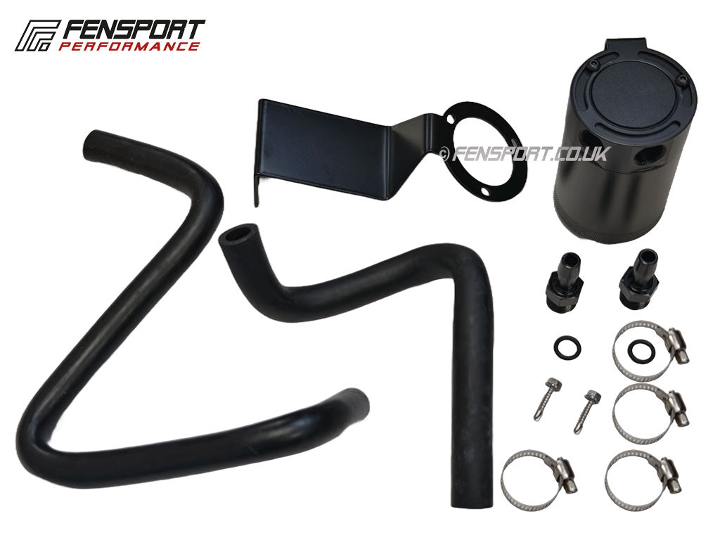 Single 2-Port Compact Baffled Oil Catch Can mounts in line with the PCV system to separate oil particles using 50 micron bronze filter