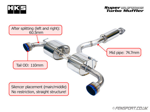 HKS Super Turbo Muffler exhaust is designed with a "straight structure" for low back pressure, low sound levels and maximum ground clearance.